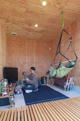 アウトドアグッズをそのままインテリアにした趣味部屋 土間や下地材の壁で男前な印象に仕上げている 家族共有のスペースなので 子どもたちがここで